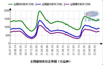 据云商平台监测数据显示:2022年6月24日,全国厚壁钢管社会库存指数为154.9点,比上月上升2.50%,比去年同期上升10.92%;其中建材社会库存指数为221.1点,比上月上升1.43%,比去年同期上升16.58%;螺纹钢社会库存量为734.59万吨,比上月上升1.83%,比去年同期上升15.38%;伴随着无缝钢管厂家部分检修减产,及需求的缓慢释放,库存上升势头开始有所放缓,临近月末开始由升转降。